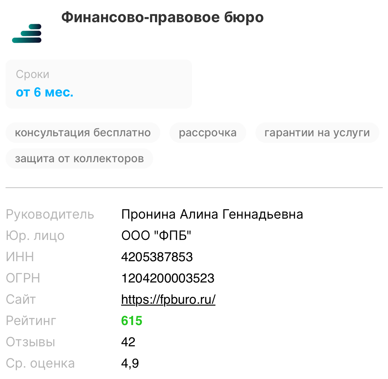 Знакомая посоветовала рассмотреть вариант банкротства. Я решила позвонить и проконсультироваться, но чтобы было из чего выбирать я записалась на консультацию в 2 организации. 1я организация, даже не помню как называется, офис находится в здании гостиницы "Лада" и 2я организация "Финансово-правовое бюро". Придя на консультацию в 1ю организацию меня начали терзать сомнения, т.к во первых - время мне по телефону было назначено, а по факту меня никто не ждал, а во вторых - у организации название было одно, а по документам другое, у них была какая то реорганизация и во всех бумагах названия разнились, получалось, что заключаешь договор с одними, а работать с тобой будут другие о которых в договоре ни слова, ну и в третьих - было еще много мелких нюансов, которые мне не понравились. В "Финансово-правовом бюро" меня ждали на консультацию, как и было оговорено ранее по телефону. На консультации разъяснили всё, вплоть до мелочей и конечно я заключила договор именно с ними и не ошиблась!!! Коллектив очень дружелюбно настроенный и что самое главное - компетентный!!! На любой мой вопрос, я получала полный ответ, сотрудницы затрагивали все нюансы, о которых я даже и не подозревала.Благодаря отличной работе сотрудников "Финансово-правового бюро" у меня все получилось! Очень рада, что выбрала именно эту компанию и очень благодарна им!!! Если решите пройти процедуру, то обращайтесь за помощью именно к ним, в Финансово-правовое бюро!!!