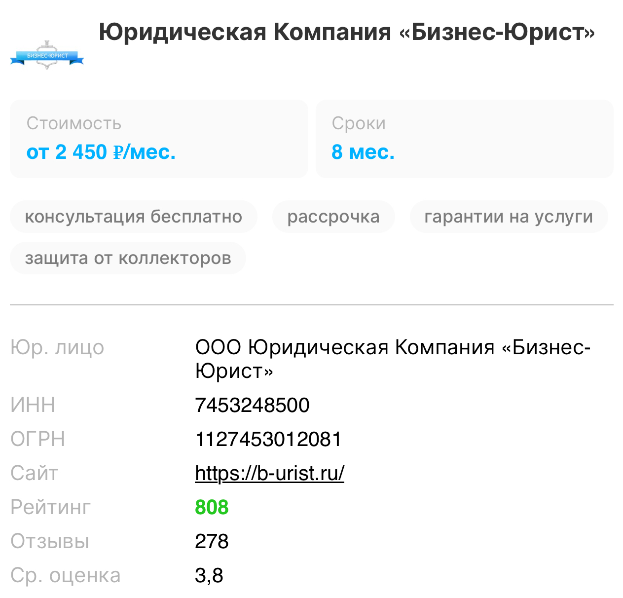 Обращался в «Бизнес-Юрист» по поводу банкротства. Долг был 800 тыс. рублей. Юристы грамотно сопроводили процесс, хотя пришлось ждать почти год. Результат — долги списаны, коллекторы больше не беспокоят. Оценка — 4/5, так как сроки немного затянулись.